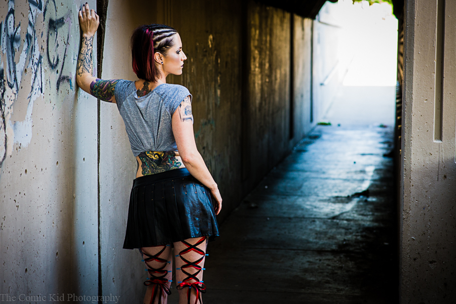 Everything in the shoot just happened to tie together almost perfectly. Tara’s hair and makeup (Done by Stormie Steen), her wardrobe choices, the location (just a stairwell behind the Albuquerque Convention Center), the prop machete and the corset piercing (Done by Scott Self) all blended together in a very horror-esque Gothic way that also somehow accidentally had a bit of Harley Quinn influences in there (don’t know how it happened but it did.)